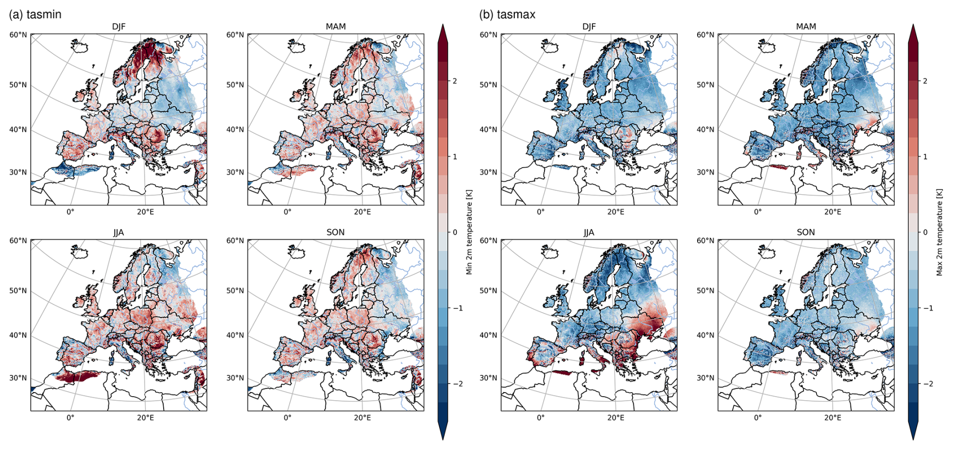 The increased minimum diffusion in ICON-CLM decreases the diurnal mean temperature bias in winter (DJF), while it is slightly increased from May to September. Accordingly, minimum and maximum temperatures are increased, which means that the already positive minimum temperature bias is getting larger. The largest positive minimum temperature bias of 0.8 K can be observed in February in Scandinavia.