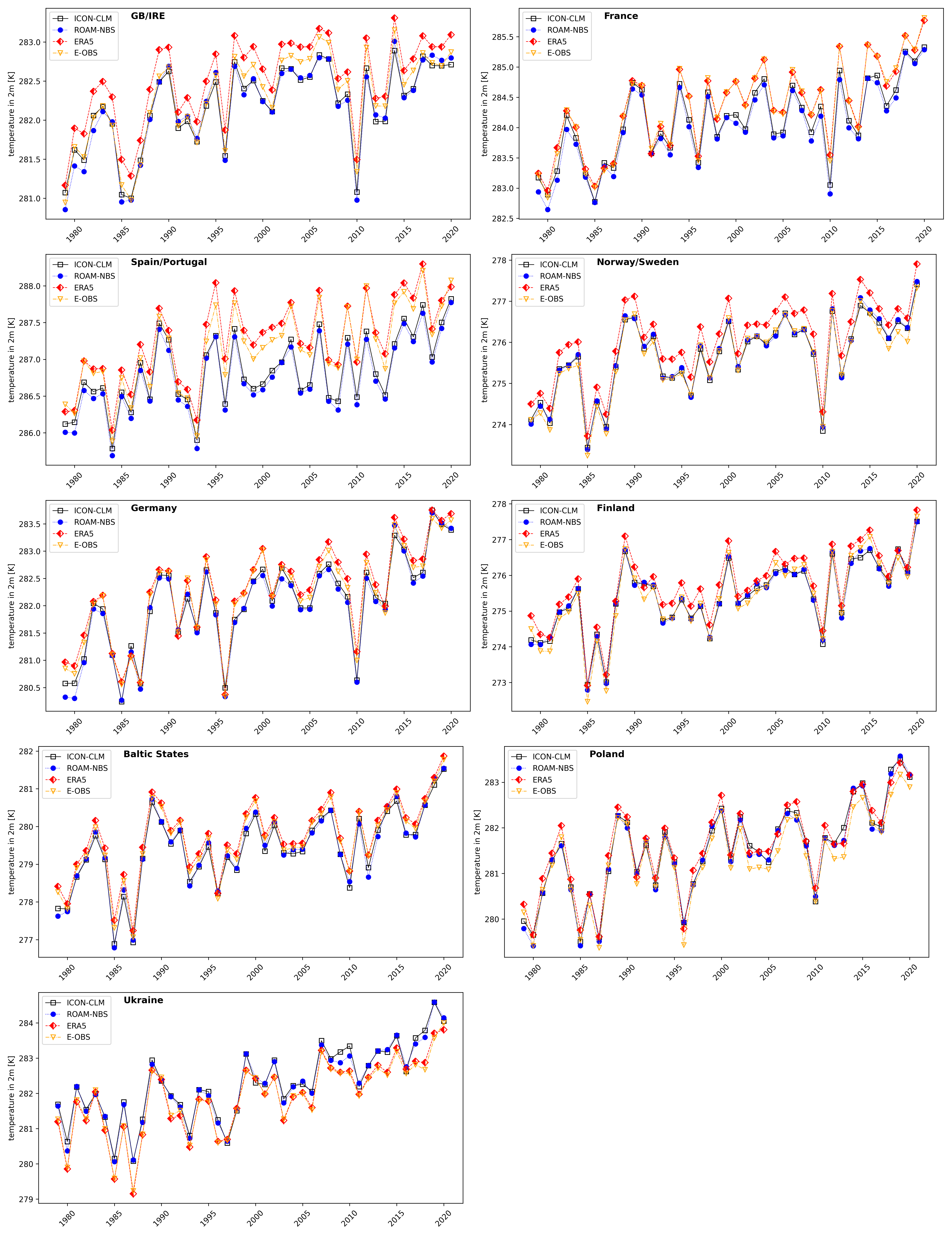 Comparing ROAM-NBS and ICON-CLM, we can say that the positive diurnal mean and minimum bias are slightly higher in ROAM-NBS than in ICON-CLM, with a very similar bias for the diurnal maximum. As expected, the wintertime SST cold bias of the ocean is also slightly reflected in the temperatures over land.