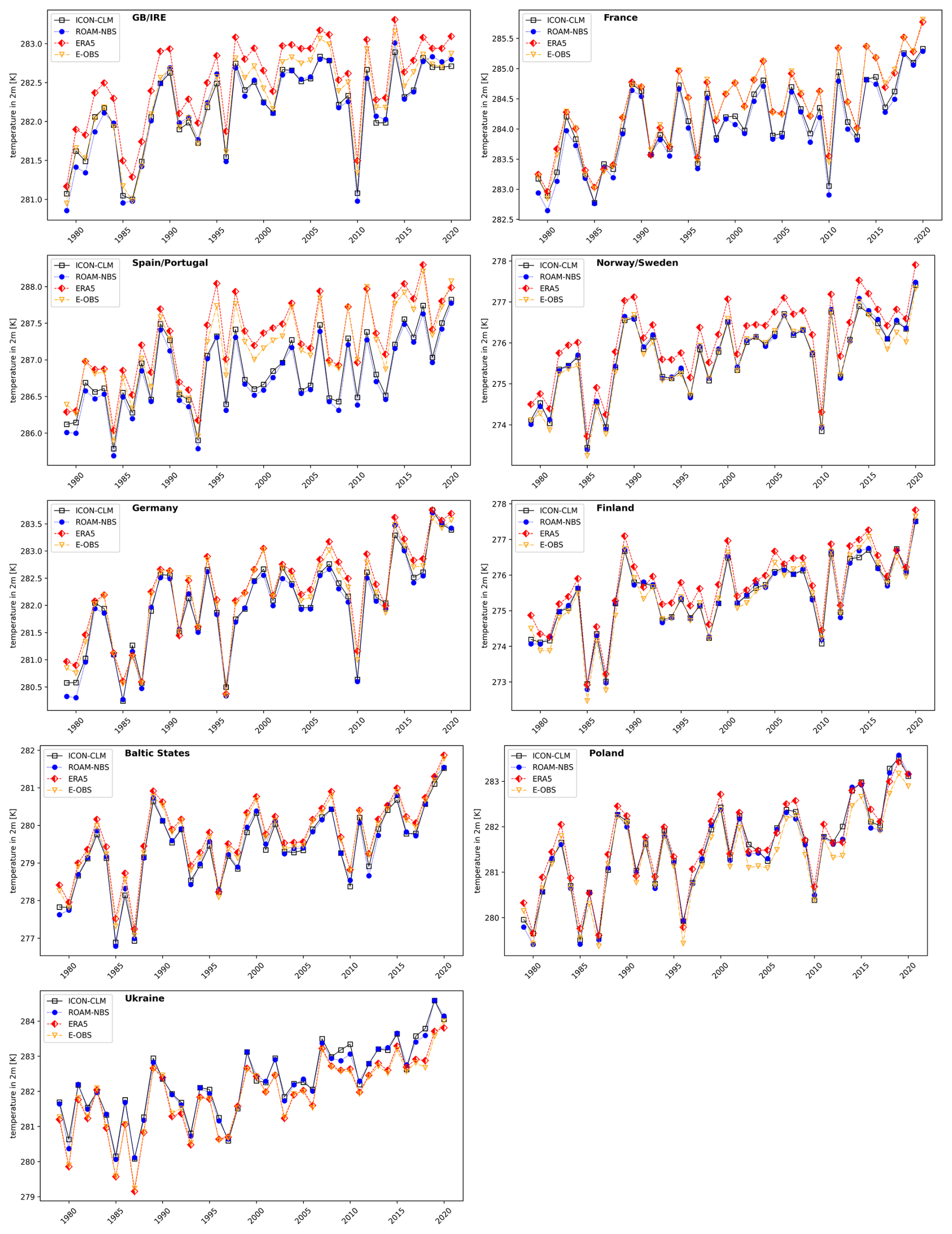 Over the ocean, the seasonal mean surface temperature differences between ROAM-NBS and ERA5 (Fig. 4a) mainly reflect the bias of NEMO against the Copernicus observations with too low SSTs in winter and too high SSTs in the Atlantic in summer. The differences between ROAM-NBS and ICON-CLM (Fig. 4b) over the ocean are identical to the ROAM-NBS/ERA5 differences by design, as ICON-CLM uses ERA5 SSTs as a lower boundary condition over the ocean. Over land, the differences are small (i.e. K) compared to the biases against ERA5.