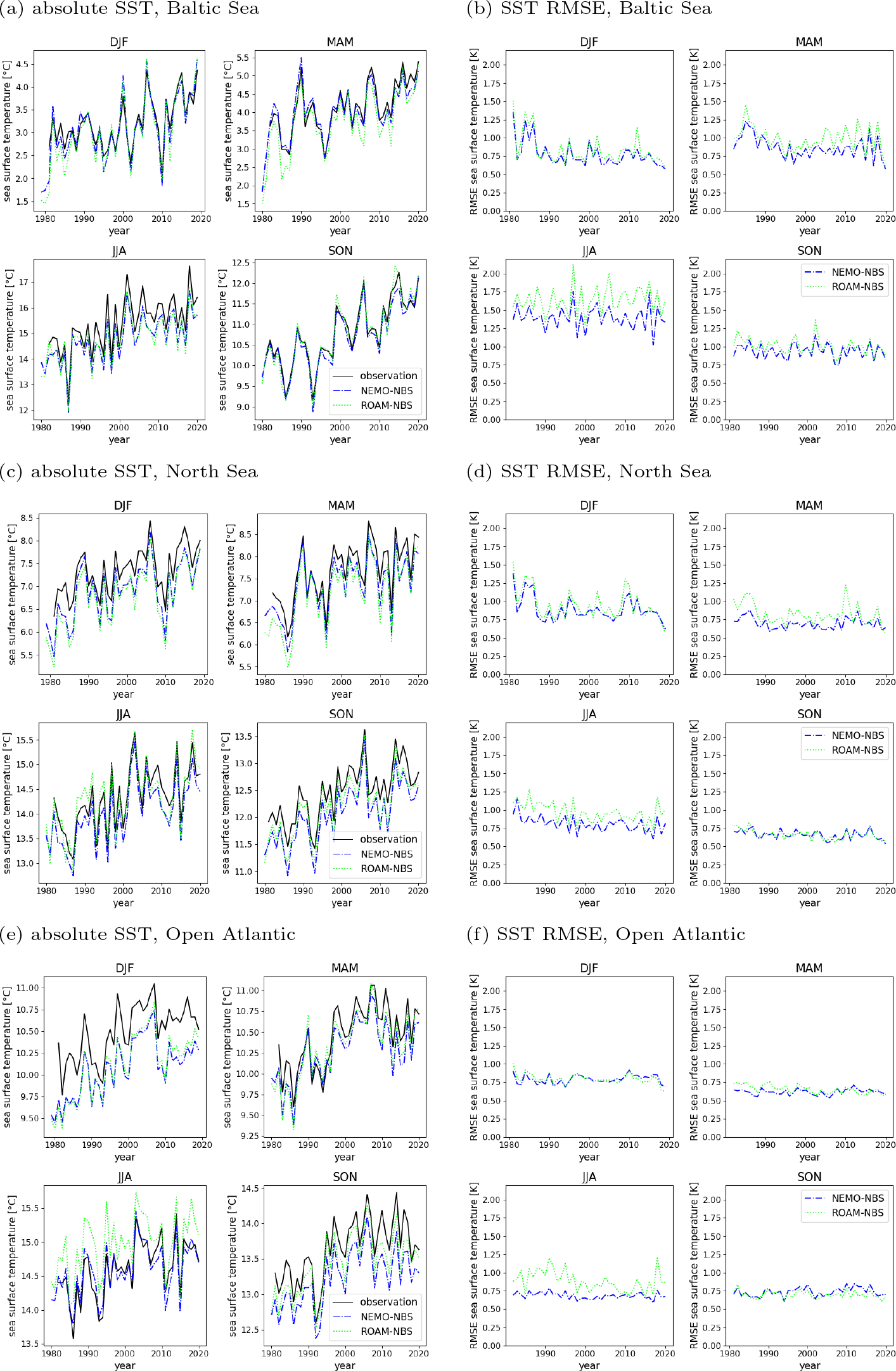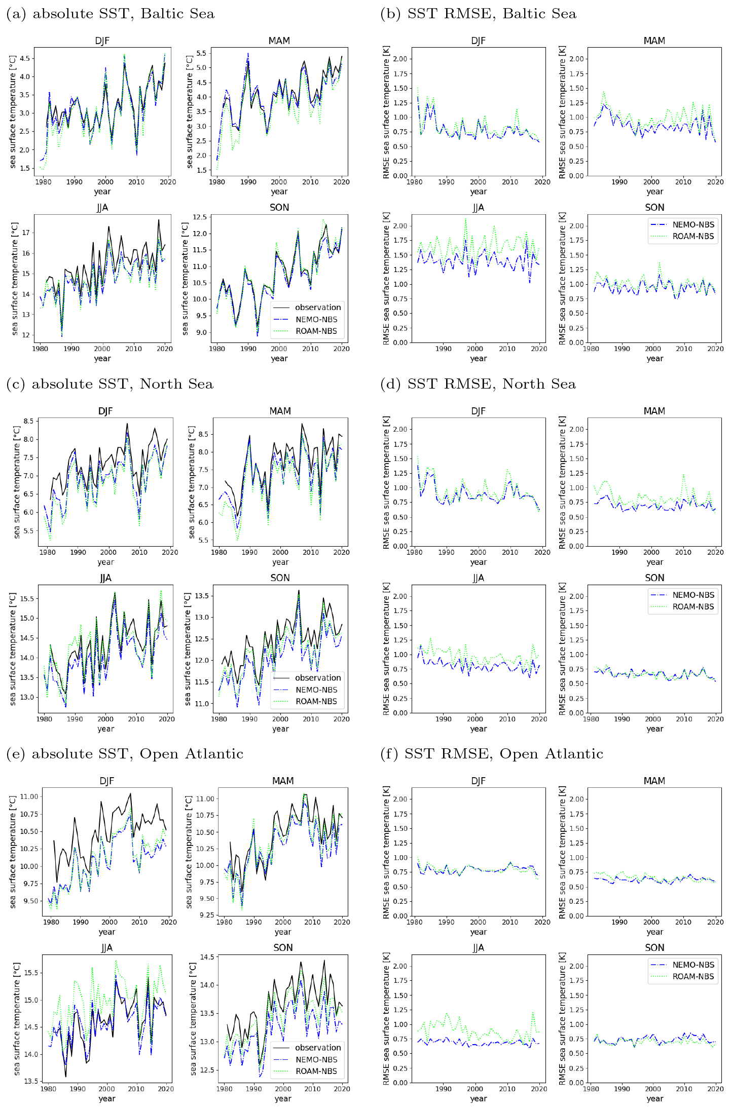 Time series of the spatial mean seasonal SST biases against the Copernicus observations are shown for different regions in Fig. 3. The outlines of these regions (Baltic Sea, North Sea, Open Atlantic, and the whole domain) are shown in Fig. 1. As for the bias maps, points with ice cover in the observations were masked out for the calculation of the biases. For the whole domain, the area-averaged bias is about −0.5 K for both simulations in winter (DJF, Fig. 3a, upper panel). In summer (JJA, Fig. 3a, lower panel), the bias is slightly larger for NEMO-NBS (about −0.75 K), but smaller for ROAM-NBS. However, this smaller bias for ROAM-NBS in summer is due to the higher warm bias in the Atlantic (Fig. 3b, lower panel), combined with a negative bias in the Baltic Sea (Fig. 3d). The magnitudes of the biases for the Open Atlantic region and the North Sea are similar to those for the whole domain, or even smaller. In these regions during the summer season, ROAM-NBS is warmer than NEMO-NBS by about 0.3 to 0.4 K. In the Baltic Sea region, the SST biases in both simulations fluctuate around zero in winter while reaching −0.75 to −1 K during summer. As the spatial averaging of biases may cancel out positive and negative values, the time series of the RMSE are additionally shown in Fig. A4. Especially in the Baltic Sea, the RMSE is, with values of about 1.5 K in summer, higher than the absolute values of the mean bias. In the Open Atlantic and the North Sea, it is comparable to or slightly higher than the mean bias, with about 0.75 K in all seasons. The present SST biases in DJF and JJA (Fig. 3) as well as the RMSE (see Fig. A4) in all seasons and areas remain reasonably stable during the evolving simulation. Thus, no accumulation of errors takes place. The time series for the absolute area-averaged SSTs (see Fig. A4) demonstrate that the year-to-year variability as well as warming trends in the North and Baltic Sea are well reproduced in both simulations.