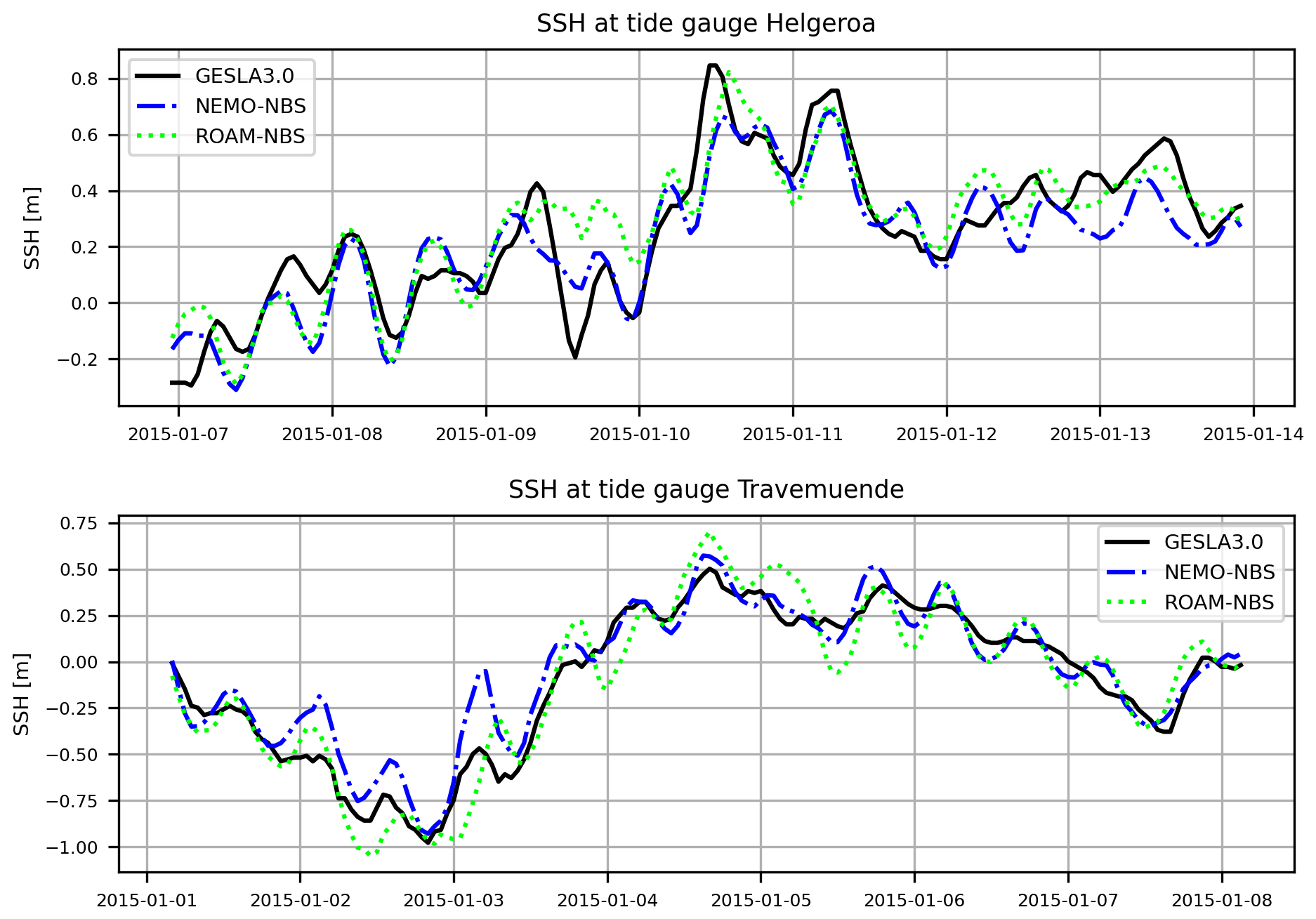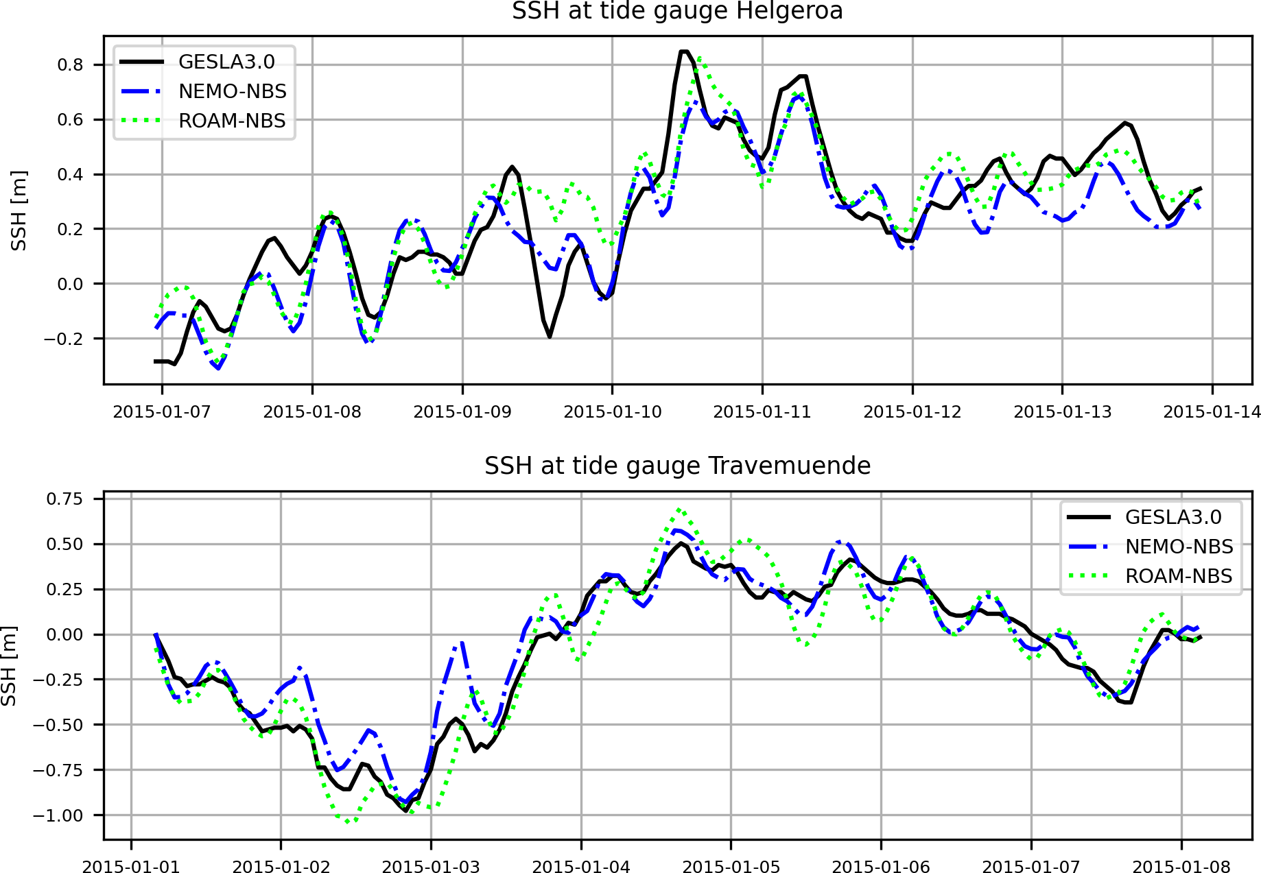 The main tidal constituents M2, N2, 2N2, S2, K2, K1, O1, Q1, P1, and M4 for both NEMO-NBS as well as the coupled ROAM-NBS are provided at the lateral boundaries using the FES2014 dataset (Lyard et al., 2021).