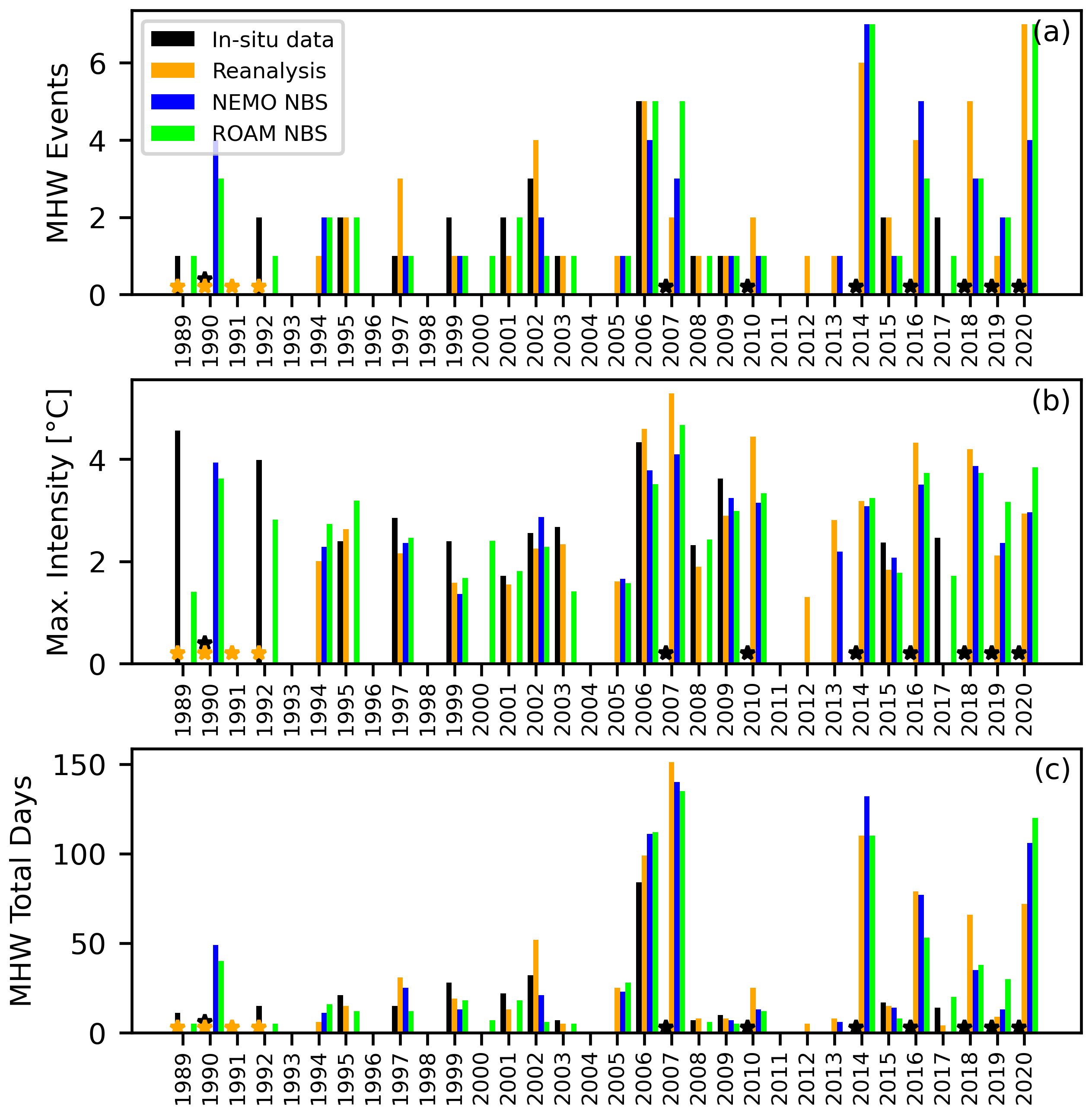 ROAM-NBS shows a cold bias of locally up to 2 K in the shallower regions of the European North West Shelf and in the Biscaya region during the colder seasons (SON, DJF, MAM). In the Baltic, the bias is around zero during these seasons. In summer, a positive bias can be observed in most parts of the NBS domain apart from the Baltic, where the bias becomes negative (up to −1 K in some years in the spatial average, Fig. 3d). A persistent warm bias is found near the northern Atlantic boundary, east of Iceland. This temperature bias could originate from the northward heat transport by the Gulf Stream at the surface and a too weak vertical diffusion/downward transport of heat at the model's boundary. The border between the positive and negative differences in all seasons except summer seems to envelope the European North West Shelf with a stronger bathymetry gradient, which could be a hint at an underestimation of Atlantic on-shelf transport (Ricker and Stanev, 2020) into the North Sea. In Fig. 2b, the difference between the seasonal mean SST of ROAM-NBS and NEMO-NBS is shown. The coupled simulation is generally slightly warmer than the uncoupled one, especially in summer (JJA). The tuning of the cloud cover scheme in ICON-CLM and ROAM-NBS reduced a positive surface shortwave radiation bias over land and ocean, so that it lies between ±10 W m−2 (see Fig. A1) in the NBS region compared to CERES data. This reduction of the radiation bias contributed to a decrease in the positive SST bias in summer. However, it was not possible to reduce it further by a tuning of the atmospheric part. Eddy diffusivity in the eastern Atlantic was parameterized to be an order of magnitude higher than in the western Atlantic, which may have contributed to the cold bias observed near the French and Portuguese coasts.