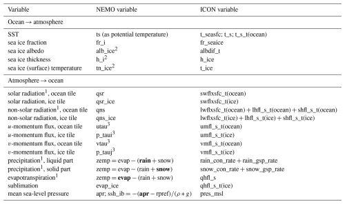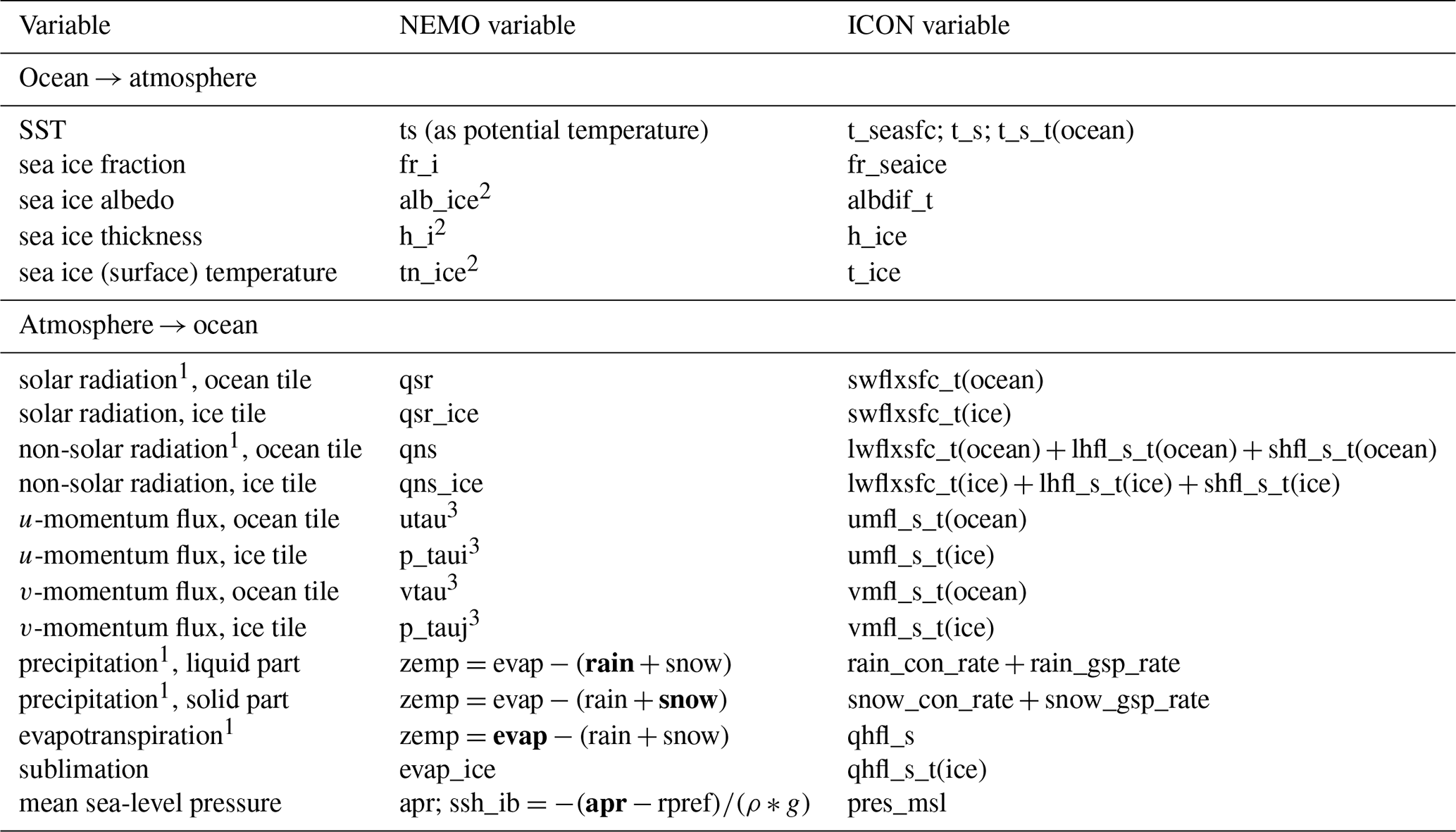 Table 1Variables exchanged between the atmosphere and the ocean via OASIS3-MCT; for variables denoted by 1, global conservation is applied by OASIS3-MCT after horizontal interpolation; NEMO variables denoted by 2 are aggregated over all ice categories before sent to the atmosphere; NEMO variables denoted by 3 are rotated from the geographical to the local grid and staggered onto the U, V grid within NEMO; “ocean” or “ice” are given in parentheses for ICON variables to indicate that only the part of the variable on the respective tile is used. Variables that are combined into other quantities directly in NEMO's coupling interface are written in bold font.