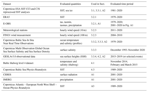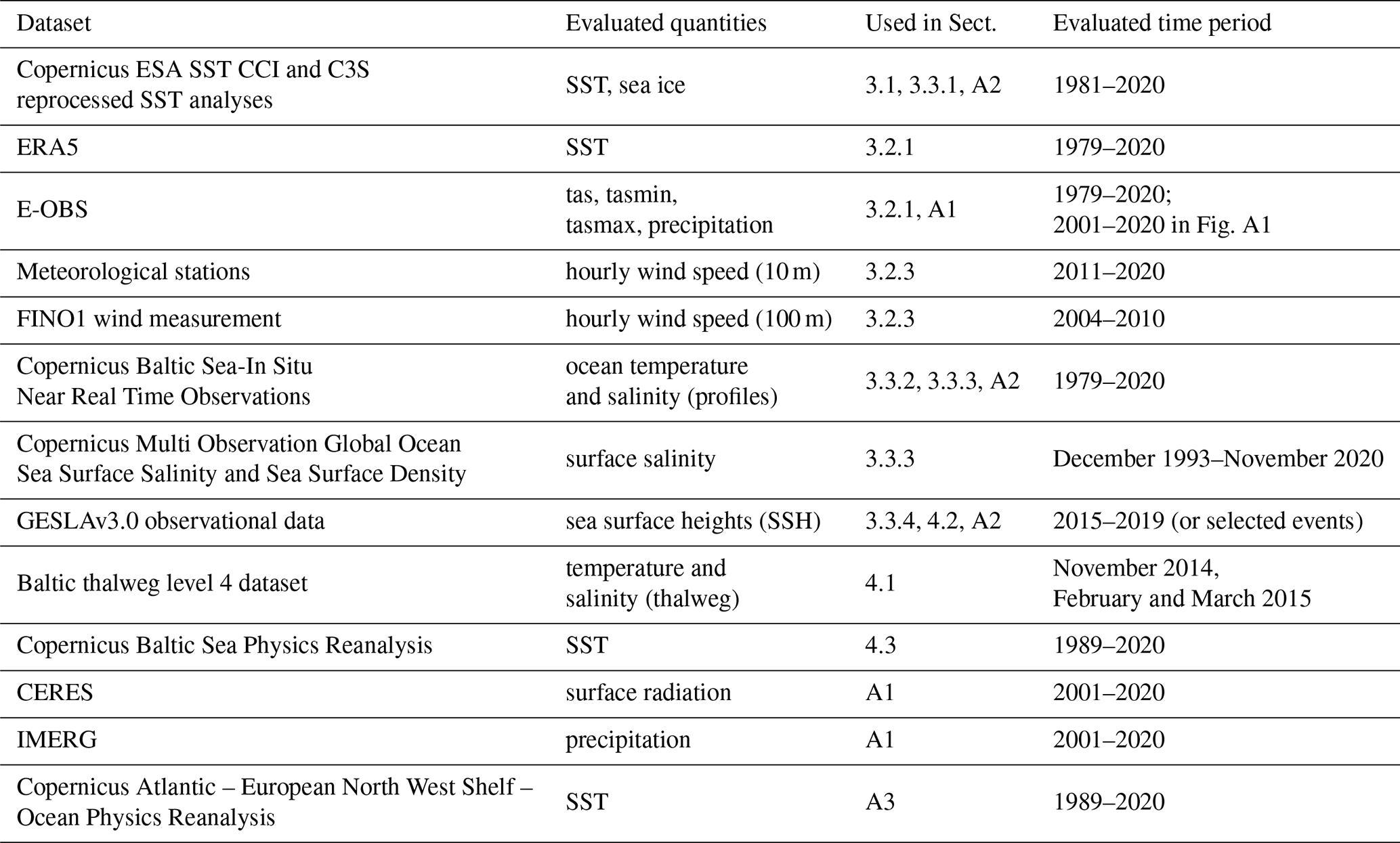 The evaluation is generally conducted for the years 1979–2020, which is the minimum period required for CORDEX. However, especially for the ocean part, many reference data are available for shorter time periods only, so that the evaluation period had to be adapted in these cases: SST and sea ice data (CMEMS, 2025a) are available from September 1981 and surface salinity from 1993 (CMEMS, 2023). Station data (CMEMS, 2024a) are very sparse before 1993. Copernicus reanalyses used for the evaluation of marine heat waves (CMEMS, 2024b, 2025b) start in 1989. For the atmospheric part, satellite data used for the evaluation of surface radiation (CERES; NASA/LARC/SD/ASDC, 2019) are available from 2001 only. Therefore, the evaluated time periods had to be adapted in these cases; an overview is given in Table 2. For evaluations in which statistics were calculated from hourly data, shorter time periods were used, partly due to limited data availability as well, partly to reduce the computational costs (see Sects. 3.2.3 and 3.3.4).