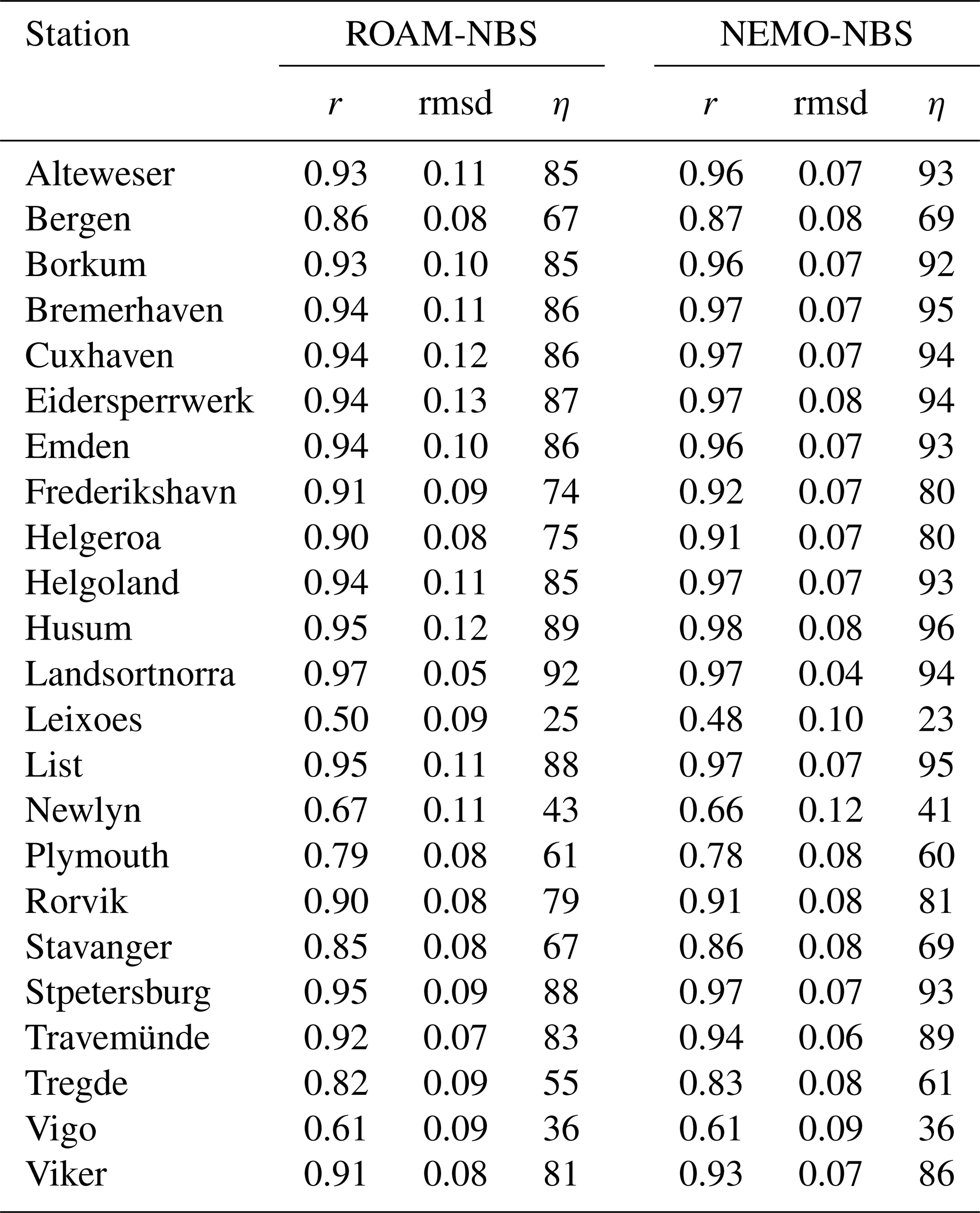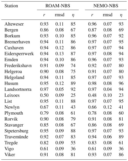 For detided sea surface heights, NEMO-NBS shows a higher correlation with the observational data than ROAM-NBS at nearly all stations, with minimal differences in correlation coefficients. The root mean square deviation of NEMO-NBS is smaller for the majority of the stations. As can be observed in the scatter plots, for detided sea surface height extreme values, especially maxima, ROAM-NBS performs better than NEMO-NBS in the German Bight, while it slightly overestimates maxima at Landsortnorra. The higher maxima at all stations obtained with the coupled ROAM-NBS simulation indicate a positive effect of the atmosphere–ocean coupling on wind speed quality. NEMO-NBS's performance for sea surface height maxima could be improved by calibrating the wind drag coefficient. Single storm events, which cannot be well represented spatially or temporally, lead to single outliers in the coupled model. These outliers are not present in the reanalysis driven NEMO-NBS results. Overall, the correlation of storm surge of both simulations with observational data is high, especially in German national waters. At stations closer to the domain boundaries, storm surge correlations could be improved. Nevertheless, overall bias-adjusted sea surface height results strongly correlate with observational data (see Fig. A7) for the coupled and uncoupled models due to a high tidal component.